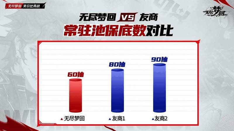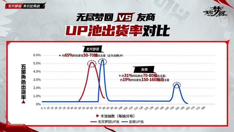 通过各项数据对比会发现,游戏卡池机制在多个方面明显优于其他同类产品。《无尽梦回》UP池80抽必出当期五星,比友商所需抽数低了一半。另外,《无尽梦回》50-70抽出五星角色的玩家占比高达65%,而友商仅31%玩家在70-80抽获得角色,且可能非UP。想在友商抽到UP角色,可能要150-160抽,相当于一两个版本资源的差距。