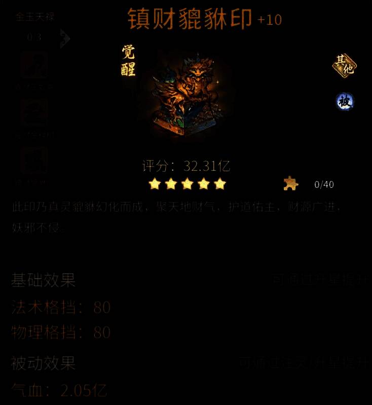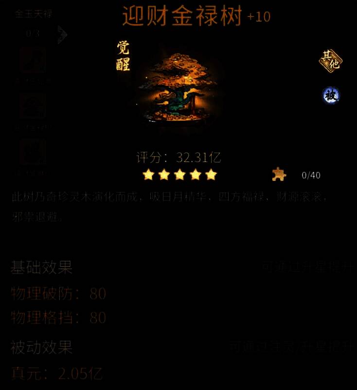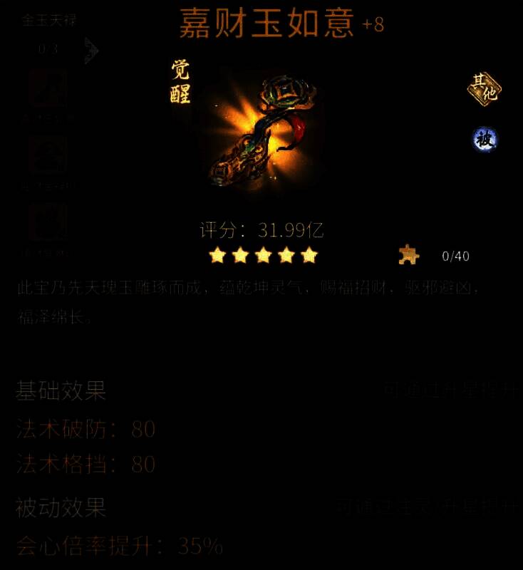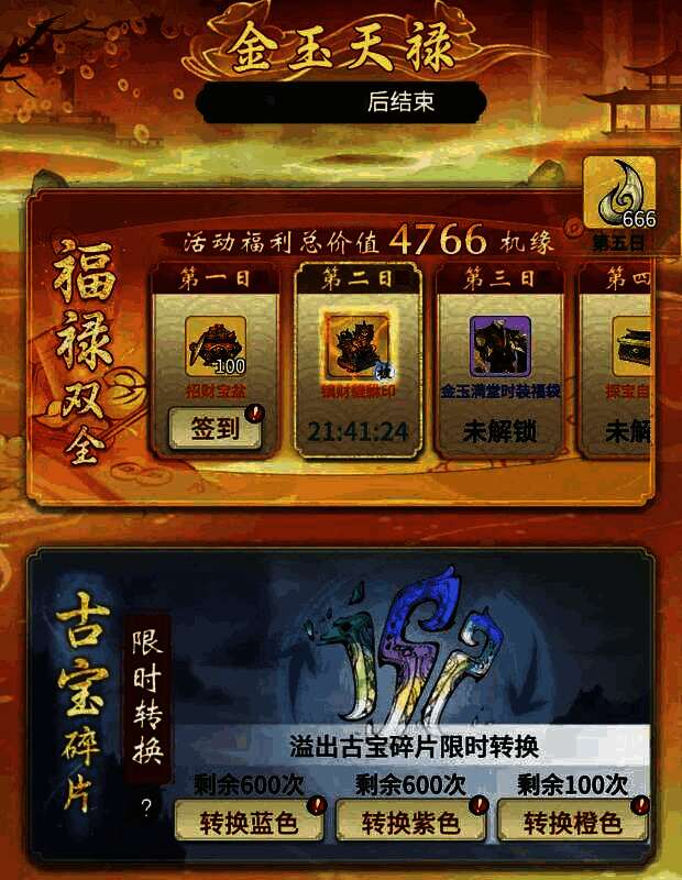 护道佑主,招财赐福,参与签到、拼图等活动,可获取古宝套装“金玉天禄”。集齐并升星古宝套装,能提升修士气血、真元等属性,修行之路更加顺畅。