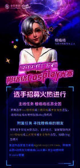 赛事同期活动也精彩纷呈。2024动感次元橙络络 cosplay 大赛正在火热报名中,参赛选手可 cos橙络络或王者荣耀角色或拳皇形象,前往所在城市寻找城市地标拍摄 vlog 及照片,发送作品至官方邮箱,带微博话题 #动感地带橙络络 cos 大赛 #并 @动感地带 M-zone 官微。海选赛成功晋级者将进入动感地带 5G 校园先锋赛分省线下赛,最终晋级全国总决赛,冠军即可成为橙络络官方 coser,获得万元大奖。