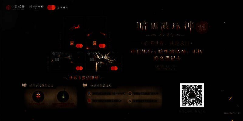 不朽专属,玩家尊享,《暗黑破坏神:不朽》×中信银行联名借记卡火爆办卡中!该卡为中信银行和万事达全国首次发布的双币借记卡,共有世界卡永恒经典款、世界卡超燃经典款和白金卡永恒审判款、白金卡奔赴未来款4种。达到60级的暗黑不朽玩家扫描下图二维码,即可预约办卡。现在开卡并激活暗黑联名卡,即有机会获得一次抽取十连强化不朽钥石的机会(限500份)。当玩家成功办理并激活《暗黑破坏神:不朽》×中信银行联名世界卡后,还可以享受覆盖衣食住行等多方面的专属特权,彰显不朽玩家的尊贵身份!《暗黑破坏神:不朽》中信银行主题网点现已正式迎客,前往打卡留念并分享照片至暗黑破坏神不朽贴吧,还有机会获得暗黑专属卡封和收藏纪念卡!