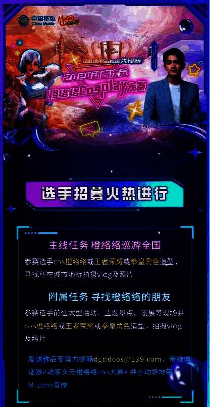同期举办的2024动感次元橙络络cosplay大赛现已火热报名中,全程3个月,覆盖全国10余省。线上海选期间参赛选手可cos橙络络或王者荣耀角色或拳皇形象,前往所在城市寻找城市地标拍摄vlog及照片,发送作品至官方邮箱,带微博话题#动感地带橙络络cos大赛#并@动感地带M-zone官微,即视为参赛成功,线上海选赛成功晋级者将进入动感地带5G校园先锋赛分省线下赛,最终晋级全国总决赛,成为橙络络官方coser,获得万元大奖。