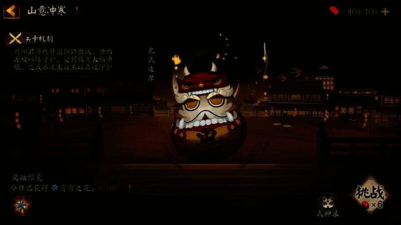 战斗时封阳君将代替阴阳师与达摩对战,在限定时间内造成怪物总血量20%的伤害后视为战斗胜利,根据敌人剩余血量结算奖励。