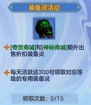①每日达到300活跃可领取一个装备灵;