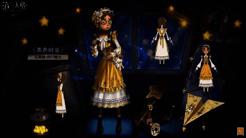 【奇珍时装】玩具商-咫尺微光身穿白色长裙,外面是金黄色的背心裙,整体温柔宁静。她头戴金色蝴蝶结发带,与星星同色系的穿搭让她看起来柔和又温暖。她的腰间挎着一个星星形状的玩具包,背上的玩具箱是个透明玻璃瓶,里面珍藏着许多闪闪发光的星星。