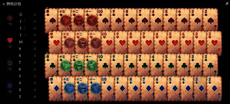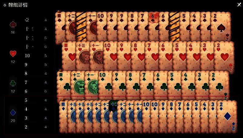 牌组构筑指的是,通过修改牌组中不同点数、花色、果酱效果的卡牌数量,来增加抽到指定点数、花色、果酱饼干牌的概率,以获取更高积分加成的局内构筑过程。