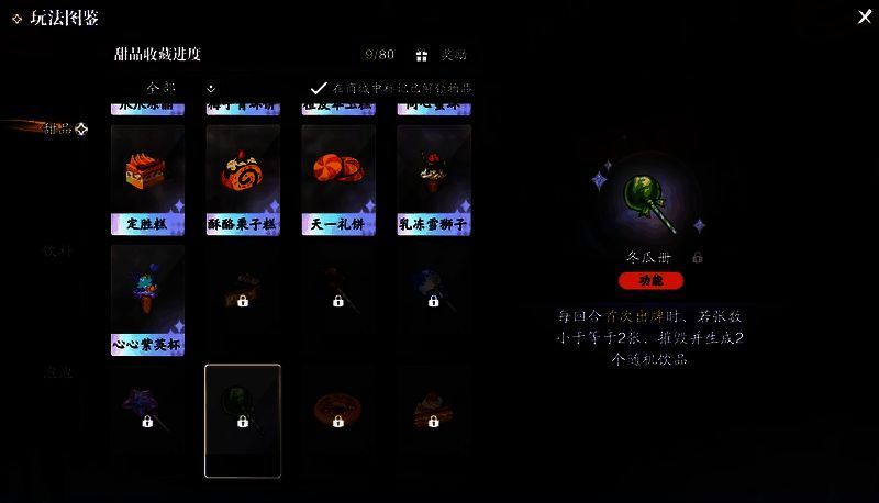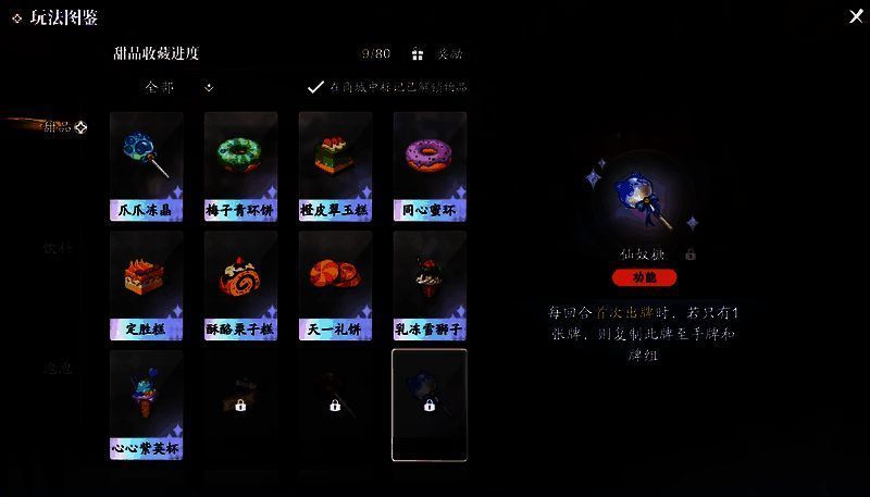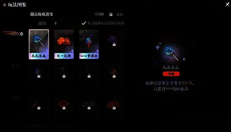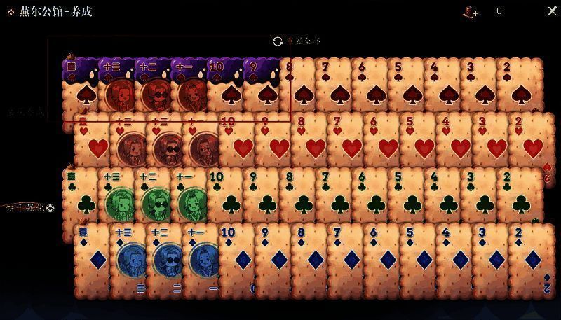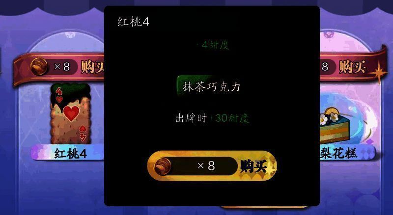 根据牌组内指定果酱饼干牌数量获得加成,吉星糕与星冰糖(出牌时,打出2张及以上的8,获得两个随机饮品)可联动提高成长效率。