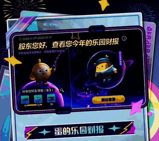 时光匆匆,2024蛋仔们都在哪些乐园地图留下美好回忆了呢?12月27日(周五)-1月17日,快来回顾蛋的24年乐园足迹,完成乐园宇宙年度分红!分享年度报告还可免费赢取套装“冬日奇想”。