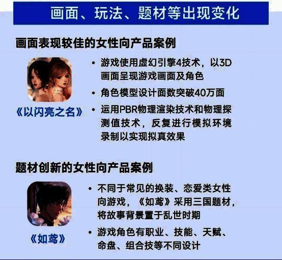 另一方面,女性向游戏赛道也正逐步迭代升级,其具体体现在画面表现、玩法、题材等方面。