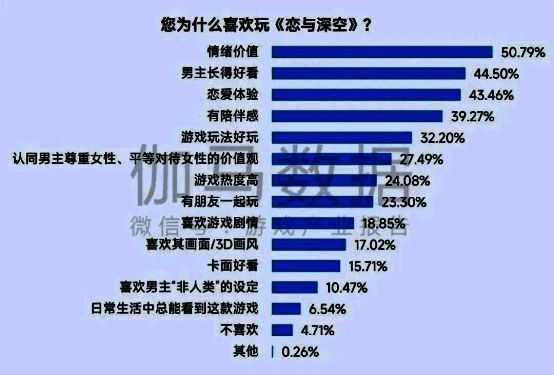 除此之外,情绪及陪伴价值也是重要成因,高热度新游《恋与深空》中也有50.79%的用户受其带动而游玩游戏。