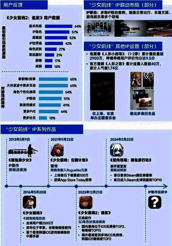 如前所述,IP游戏是2024年产业规模增长的重要驱动之一,IP游戏也创下5年以来的规模新高。未来,伽马数据看好“中国原创游戏IP”的潜力价值。这是由于中国原创游戏IP具备“自由度、潜在性价比双高”的特征,其中,高自由度在于IP的研运、品牌建设等,均由游戏团队自主把控,团队的发挥空间更大;高潜在性价比源于版权归属,由于IP归属于团队自身,因而在运营近似影响力的IP时,中国原创游戏IP能以最高的比例将商业回报、品牌影响力、用户口碑等价值留于企业之内。值得注意的是,如果打造的IP能够具备全球影响力,那么各地区、各终端、各平台均将成为IP的价值来源,从而显著抬升IP潜力上限。本次报告以散爆网络旗下的“少女前线”IP为例进行分析,从成果来看,“少女前线”系列的全球用户量已超3000万,辐射人群超过2.4亿。同时,自2018年《少女前线》成为首个登顶韩国iOS游戏畅销榜的中国移动游戏,IP的境外知名度便持续攀升,最新作品《少女前线2:追放》海外服首日新进用户超过200万,并登陆美、日、韩等多地的头部榜单,3日流水破亿。在国内市场,IP生命力也是《少女前线2:追放》在经历开服的口碑危机后能够逐步回升的重要因素。整体而言,在全球范围内“少女前线”是成功赋予IP长线生命力的中国原创游戏IP典型代表。
