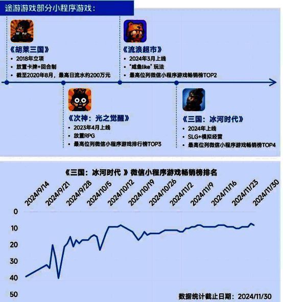 针对小程序游戏赛道,途游游戏具备入局较早、研运经验成熟等优势。2018年,途游游戏首款小程序游戏《胡莱三国》正式立项,并取得了约200万元最高日流水的成绩,在此之后,企业又陆续产出《次神:光之觉醒》《流浪超市》等多款高流水小程序游戏产品,并逐步将品类从轻度休闲类拓展至SLG等中重度品类。当前,途游游戏仍在持续推动品类迭代,其成果有望进一步巩固企业在小程序游戏领域的领先地位。《三国:冰河时代》是品类迭代的典型代表:基于《胡莱三国》的研发经验及市场表现,2024年,途游游戏以自研自发形式推出了第二款三国题材原创小程序游戏,并且,不同于《胡莱三国》的轻度玩法,新品《三国:冰河时代》采用SLG+模拟经营玩法,实现了产品的差异化竞争。从成果来看,游戏上线后最高位列微信小程序游戏畅销榜TOP4,且多次进入微信小程序游戏畅销榜TOP10。其海外版本《Ice War》也已上线印度尼西亚、菲律宾GooglePlay,并多次对英雄角色、建筑、阵营和联盟玩法等内容进行迭代更新,累计下载量约10万。轻度与中重度品类同步发展,有望使途游游戏长期位于小程序游戏赛道头部。
