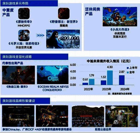 贪玩游戏另一发展优势基于游戏产品多元布局能力。在保持中重度品类优势的基础上,贪玩游戏开始尝试布局泛休闲类的游戏产品,以及App和小程序游戏双版本发行的产品,类型涉及放置MMO、休闲竞技等,其中《小兵大作战》双版本均表现稳定,上线第二天登顶iOS免费游戏榜首,小程序游戏版本最高进入微信小程序游戏畅销榜TOP5。同时,贪玩游戏逐步将优势扩展至境外,在欧美、东南亚、日本、韩国等多地区有所突破,并荣获“2023年度中国游戏出海扬帆奖”。随着全球化战略的稳步推进,贪玩游戏的多元布局能力有望持续带动增长。此外,贪玩游戏还通过参与线下展会、公益活动等形式提升品牌影响力,从而进一步强化市场竞争力。