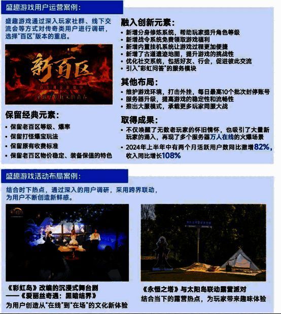IP游戏的长线运营是盛趣游戏的核心潜力之一,精准的用户洞察能力是潜力深层原因。基于用户洞察,盛趣游戏从游戏内容及活动等方面着手布局IP游戏长线运营。首先,游戏内容方面,盛趣游戏注重目标用户群体需求偏好,在游戏经典与创新层面取得较佳用户反馈,其中旗下《热血传奇》“新百区”具有代表性, “新百区”一方面保留老百区等级、爆率、玩法等经典设置,另一方面推出分身修炼系统、挂机系统等优化措施,版本推出后游戏活跃用户规模大幅提升。其次,游戏活动方面,盛趣游戏注重用户生态建设,结合时下的热点,通过深入的用户调研,采用品牌联动、专项活动等方式提升IP影响力与用户黏性。