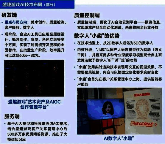 对于产业新兴技术的持续探索将成为盛趣游戏长期潜力点,其研发技术的应用落地助力企业游戏业务与拓展业务共同释放价值。为紧握人工智能技术发展机遇,2023年,母公司世纪华通将原“云数据事业部”升级为“人工智能云数据事业部”,在原有基础上开展算力业务。现阶段,盛趣游戏已将AI技术应用至游戏研发、客服、虚拟主播、质量测试等领域并投入AI技术人才培养,针对产出内容还不断升级迭代提升成果品质。此外,企业还拓展布局AR、VR、元宇宙、脑科学等新兴领域,致力于提升底层技术能力实现全产业链布局,未来企业将以游戏产业为核心发散多领域潜力。