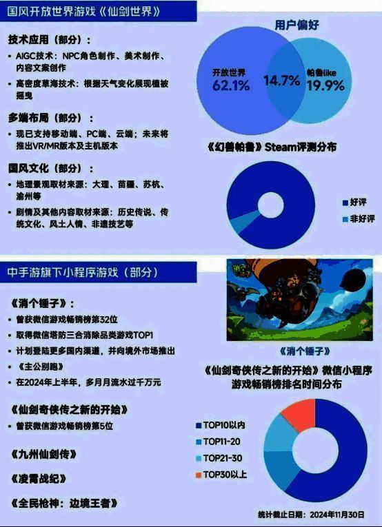 国风开放世界游戏、布局小程序游戏将进一步促进中手游集团拓展潜力领域。国风开放世界游戏方面,中手游自主研发的《仙剑世界》将于2025年1月9日上线,其占据了“国内、仙侠+开放世界”“大型游戏+帕鲁like”2个细分元素的先发位置,先行布局的优势有望加持产品表现。在此基础上,《仙剑世界》通过创新技术的应用提升游戏场景拟真效果、多端布局提升用户游戏体验,确保产品基础品质;同时加入多元的国风元素助力中国文化传播,强化了产品的传统文化属性。多项元素并重,《仙剑世界》的潜力上限值得产业关注。布局小程序游戏方面,在中手游的积极布局下,2023年已推出多款小程序游戏上线运营,并为集团带来超6亿元收入,此外,中手游集团还积极布局小程序游戏出海业务及小程序游戏的长线运营,例如《消个锤子》计划上线新加坡、马来西亚等地。上述布局将成为企业新增长点。