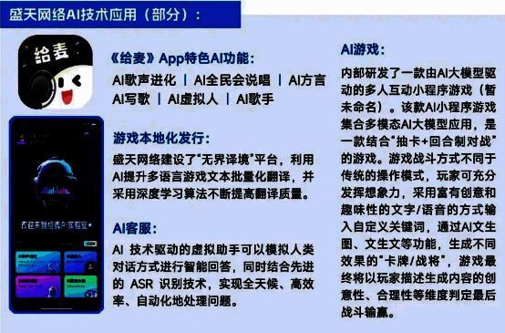 技术是盛天网络业务潜力的核心基础,大数据、游戏引擎、AI等相关技术成为企业业务稳健的关键因素。多年来,盛天网络专注于技术研发投入,企业研发人员占比连续多年保持在半数左右,累计有多项发明专利及软件著作权产出,并且,企业还建立技术研究实验室推动新兴技术和业务的融合与创新,现已成功开发了AI-SaaS平台工具。技术应用方面,由于业务覆盖多个领域,企业技术研发成果应用空间较为广泛,以AI技术为例,企业已将技术应用至旗下音乐社交平台“给麦”App、游戏本地化发行及AI客服等领域。未来,技术的研发与深度应用将进一步拓宽企业业务边界。