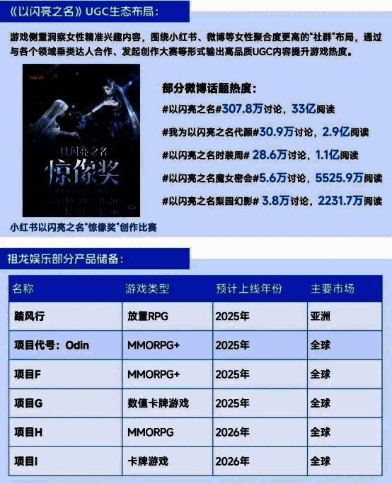 祖龙娱乐的多元品类布局与全球研运一体化战略成为重要潜力点。多元品类布局方面,祖龙娱乐以擅长的MMORPG品类为基准,逐步向SLG、女性向、策略卡牌等品类拓展,并在多个新品类产出优质产品的同时,打磨出新品类相应的运营打法,进而将初次探索品类转为擅长品类,稳固多元产品结构。其中,旗下女性向产品《以闪亮之名》通过不断推出的新活动、新玩法建设的UGC生态具有代表性,良好的UGC生态为企业带来了降低买量成本、提升用户黏性等利好。全球布局层面,祖龙娱乐以研运一体化为主导战略,在强研发的基础上提升游戏全球自发行能力,通过重点关注不同市场文化、法规及用户需求等特点调整相应宣发策略,并基于研发优势调优游戏本地化,现阶段,祖龙娱乐国际市场业务已在多个品类上取得成果。此外,全球市场的多个品类产品储备将进一步推进企业全球化、多元化业务布局。
