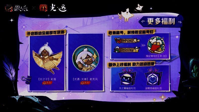 温暖组局,与光同行!《狼人杀官方》X《光·遇》特别活动温暖上线,这个冬日,“光之子”和你相约狼人杀,温暖组局!游历《狼人杀》游戏内《光·遇》场景,即可解锁限定称号;双人场限时返场,单人匹配功能上线;温暖值系统开放,守护你的每场对局;还有联动趣味表情包、永久麦克风、光之翼福盒礼包等惊喜福利等你来拿!
