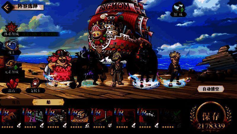 推荐阵容二:SSS大剑豪·米霍克(潜能之力五星)SSS光月御殿+SSS烬+UR和之国.大妈+SS+雷利。专属船只:UR棺船。