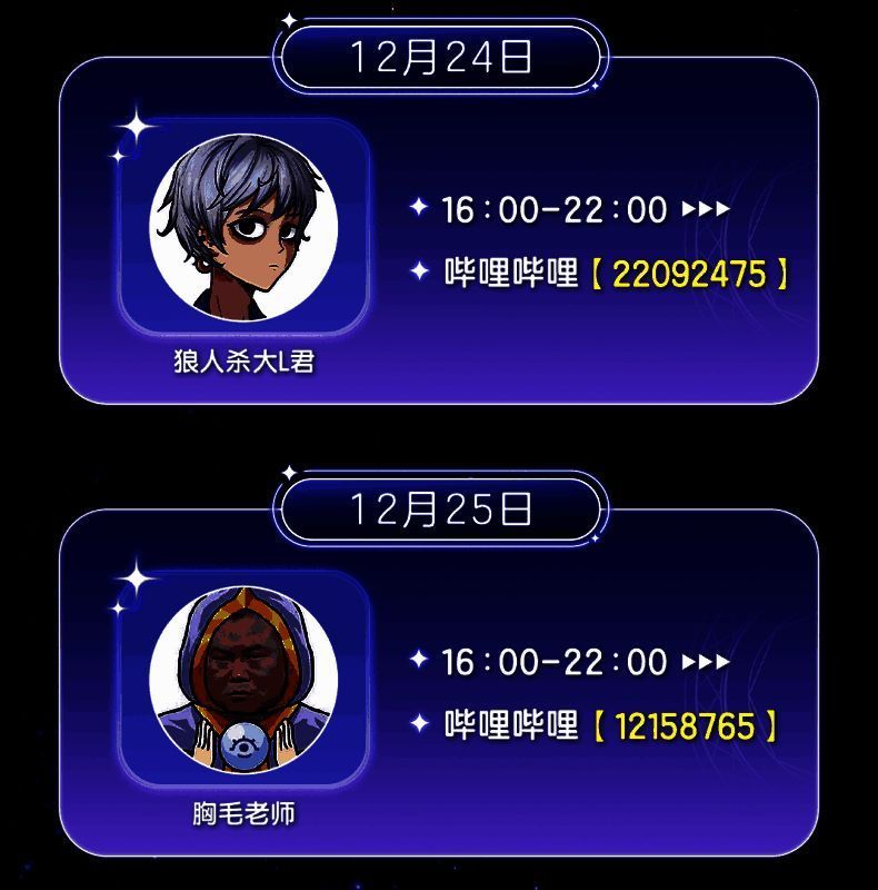 12月24日至1月8日指定时间段期间,官方将邀请狼人杀大L君、胸毛老师等22位大神主播进行不间断轮播,活动期间内观看直播不仅有机会与主播入座同玩,还可获得主播不定时抽送的《光·遇》官方周边及《狼人杀官方》周边惊喜福利!