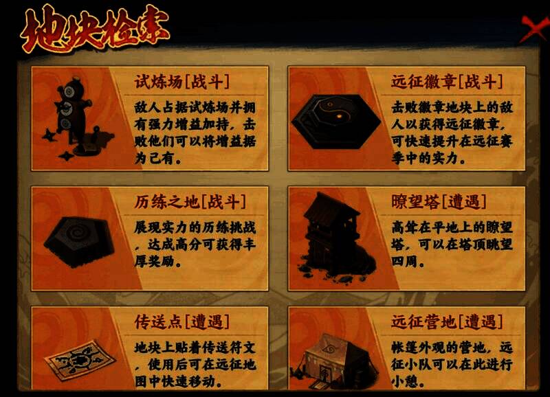 2、探索地块的过程中,建议优先收集“远征”主题徽章,“晓”和“木叶”这两种主题徽章根据自身情况,按需获取;