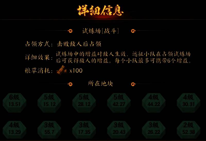 1、在探索的过程中,会出现“试炼场”地块,占领此类地块后,可以获得不同类型的增益,每个小队最多可携带6个增益;