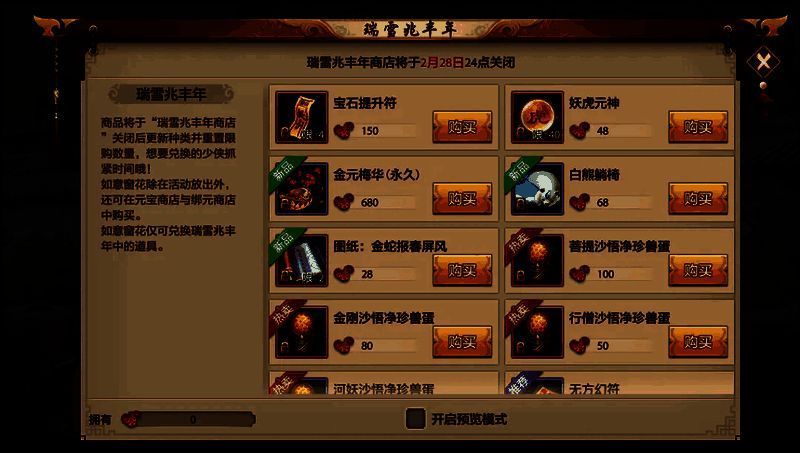 瑞雪兆丰年商店将于2025年1月1日-2月28日期间开放,为期两个月。本次活动代币变更为如意窗花,在此期间,少侠们完成一月、二月内的任意主题月活动、在元宝商城或绑元商城购买都可获得。