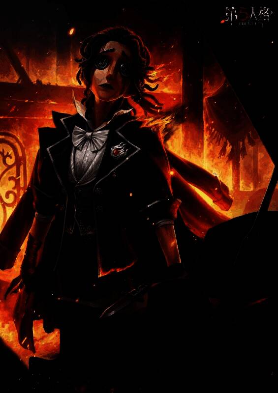 在时装海报中,【奇珍时装】作曲家-被遗忘的乔治身穿黑色燕尾服,外套上有一个银色徽章,纹样有似燃起的火焰。黑色长发随意扎起,看起来不羁且奔放。燃烧的演播厅,被火焰燃着的衣服和头发,画面看起来十分悲怆。