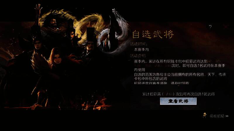 为了避免过于随机的武将招募体验,青春服正式上线后将同步增加自选武将活动:赛季内在所有卡包中累计消耗铜钱招募的次数达到一定标准时,玩家可于已解锁或开启的卡包中自选武将并获得。