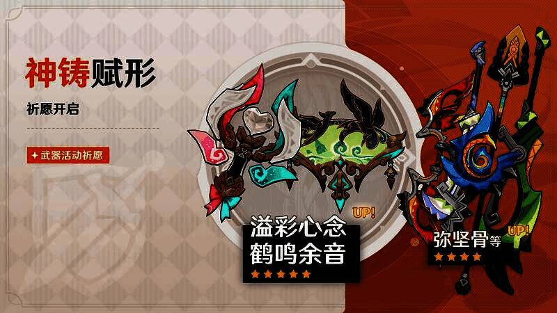 除此之外,「神铸赋形」活动祈愿也已开启,全新限定五星武器「法器·溢彩心念」、限定五星武器「法器·鹤鸣余音」迎来概率UP!