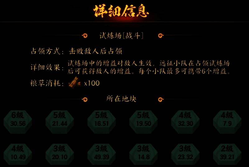 1、在探索的过程中,会出现“试炼场”地块,占领此类地块后,可以获得不同类型的增益,每个小队最多可携带6个增益;