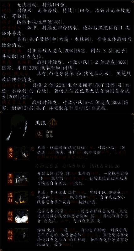 (3)多由也[秽土转生]能造成特效“魔音”,使敌方无法行动,还能为小队忍者附加“物质化灵”,提高小队忍者的输出;