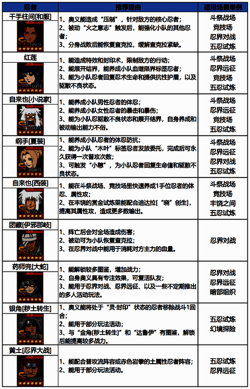 a、以上远征忍者的推荐理由仅供参考,不分先后,需要根据不同的环境和自己所拥有的忍者进行合理选择搭配;