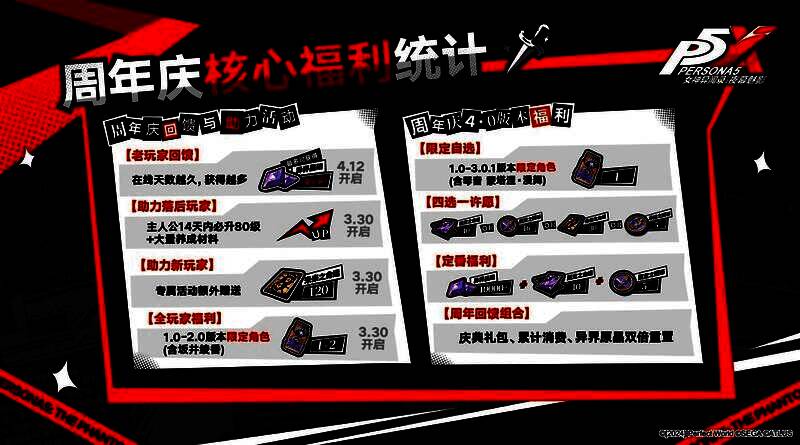 4月10日周年版本上线后,全服所有玩家还可免费获取1名3.0版本前的限定角色(含P5心之怪盗团全角色)。