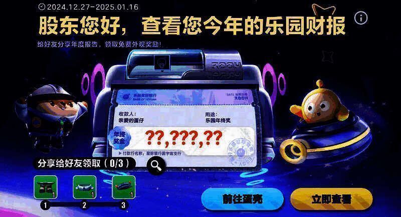 乐园的记忆如星河般璀璨闪耀。2024年12月27日-2025年1月16日,蛋仔星球公司年度分红报告新鲜出炉啦!各位蛋仔股东可在【活动中心】-【嘉年华】的【乐园年度财报】 页面,前往蛋壳小程或点击【立即查看】,接收今年的乐园财报;将财报分享给3位好友,还可免费获得“冬日奇想套装”外观。