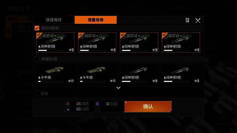 那么有兄弟要问了,什么是“增量维修”?一句话概括就是:消耗一定的资源,舰船在主基地时就能更快地维修。这个新功能到底有多逆天呢?以阋神星I级为例,不需要花费很多资源,维修的时间就可以从7分钟缩短至3分钟!