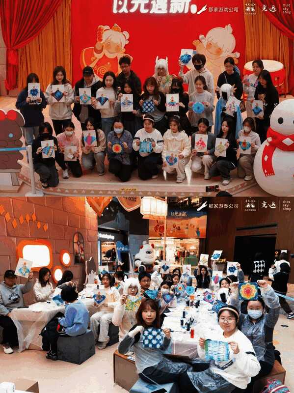 走进西单更新场商场的中庭广场,就会被六扇门和2米多高的麻花雕像吸引目光,随着视线上移,能看到巨大的福娃趴在玻璃穹顶正在热情打招呼。中央的焦点区域是圆形舞台,台上垂挂着大红和金黄交织的幕布,相当亮眼。现场还设有关于TGC和光之子的故事小展,以及玩家的无料展示和互动交流区。除了用心的场景布置,友友会还给光之子们呈现了三场别出心裁的活动——点燃全场的聚光跨年派对、温暖人心的友友会拥抱日、结合扎染文化的彩染季无料小课堂,展现了光之子的热情、美好与才华。