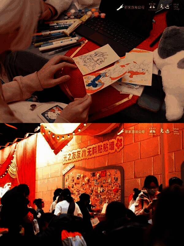 墙上部分的无料作品,来自于第一届友友会杭州站。由光之子创作的无料,小到一张贴纸,大到一个手办,都被友友会悉心保护,从杭州运输到北京,完成了一场穿越时空的交流、传递与分享。友友会鼓励玩家一起创作与分享无料,让无料交换成为创意与情感交流的载体,一起发挥创想,吸引志同道合的伙伴,分享彼此的温暖与支持。让友友会不只是一场简单的快闪,更是绽放光之子才华与美好的平台。