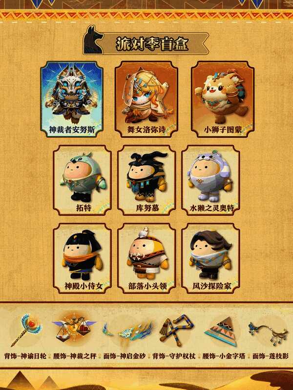 “金字塔传奇”派对季活跃活动正式开放!完成全新派对季活跃任务,即可前往兑换商店获取稀有盲盒“巨鳄拉维坦”、稀有配饰“卡诺卜罐”、“壁画眼镜”,更有赛季限定全新表情“扭捏”、“蛋乃伊”,动作“亡灵舞”、“祈祷舞”,和“生命之流昵称框”等奖励等待兑换。