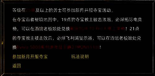 等级在25级及以上的勇士可参加“新月”“流云”开服夺宝活动。夺宝活动连开8天,电竞椅,显示器等你来爆!