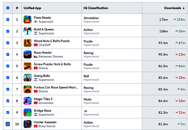 在 2024 年全球超休闲游戏下载排行榜中,Supersonic 同样表现亮眼。data.ai 数据显示,Supersonic 共有 3 款游戏进入年度榜单前 10 名,其中来自中国团队的《Build a Queen》排名第 2,《Going Balls》和《Bridge Race》分列第 6 和第 9 位,并有 7 款游戏跻身前 50 名。
