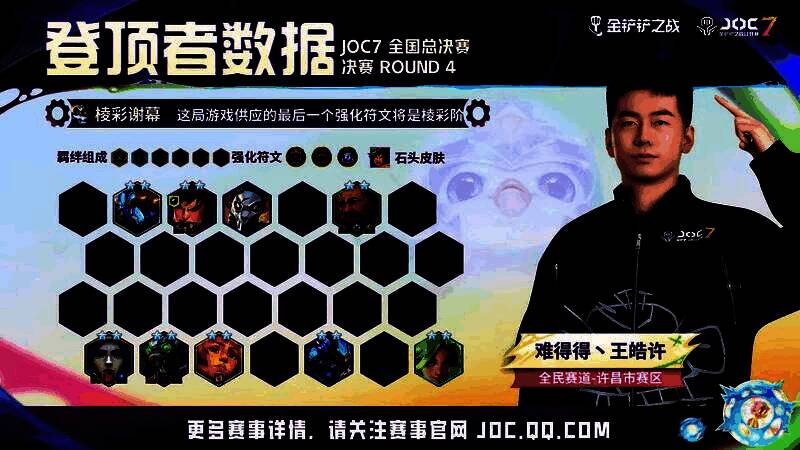 3月8日,第七届金铲铲之战公开赛(JOC7)全国总决赛-决赛在重庆体育馆正式开打,来自全民赛道的难得得丶王皓许以直落四局的出色发挥成功打破JOC赛事历史最少夺冠局数纪录,成功捧起职业生涯的首个JOC冠军。