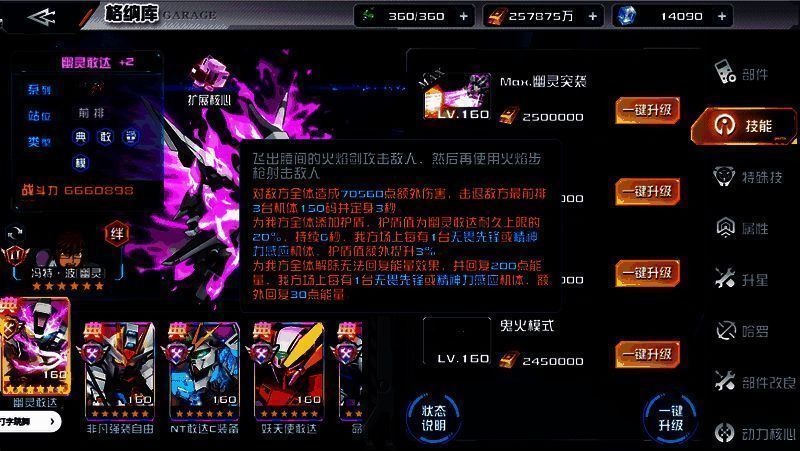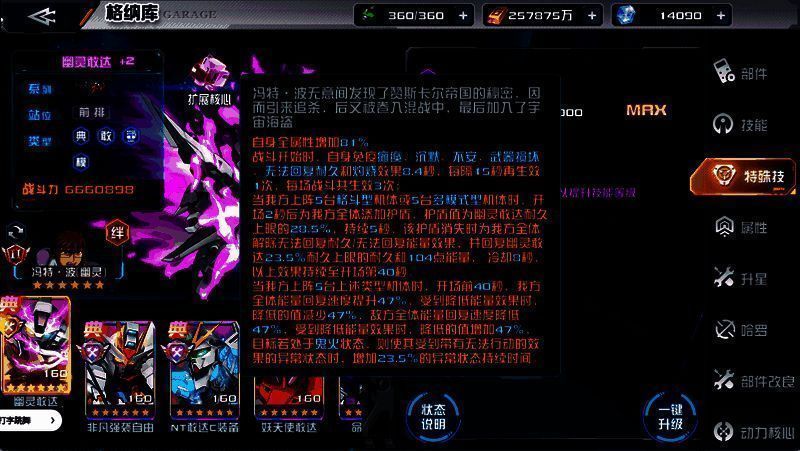 队长技【死亡先锋】,则能上场时就为我方所有机体增加能量,所有格斗型和多模式型机体攻击频率额外增加40%。而缘分技【宇宙海盗】,当满足特定的机体上阵条件时,幽灵敢达能够大幅提升自身及队友的能量回复速度,让整个队伍在战场上如虎添翼。如果使用机师技能,更能直接提升自身81%的属性!