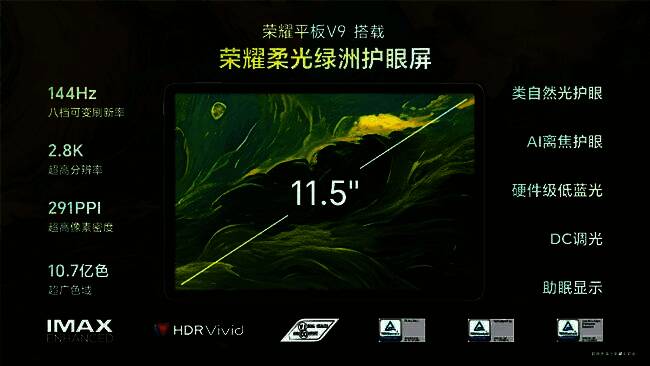 硬件方面,荣耀平板V9以仅475g的重量和6.1mm的机身厚度,成为同尺寸级别最为轻薄的产品之一,产品搭载11.5英寸荣耀柔光绿洲护眼屏,拥有2.8K超高清分辨率和10.7亿色超广色域,并通过类自然光护眼、AI离焦护眼、助眠显示等有效减轻视觉疲劳。续航上,荣耀平板V9配备了同尺寸断档式领先的10100mAh大容量电池,可以实现13小时以上连续短视频或阅读,还能实现80天的超长待机和620天的超长保电,做到拿起即用。