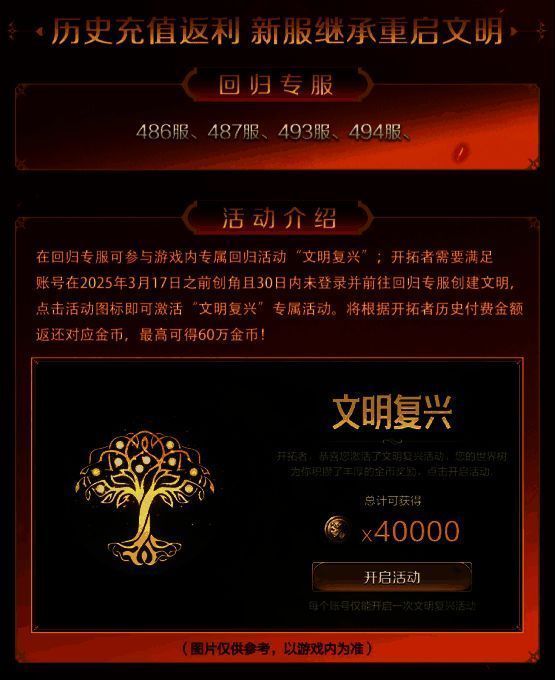 而对于那些回归后想到新区从头体验游戏的玩家来说,新服的福利同样也是不少,单纪元人人都能领到的11张橙卡,341抽直接拉满你的英雄仓库!同时,在专属回归活动“文明复兴”中,专属活动将根据开拓者历史付费数据返还对应金币,最高可得60万金币!诚意满满。