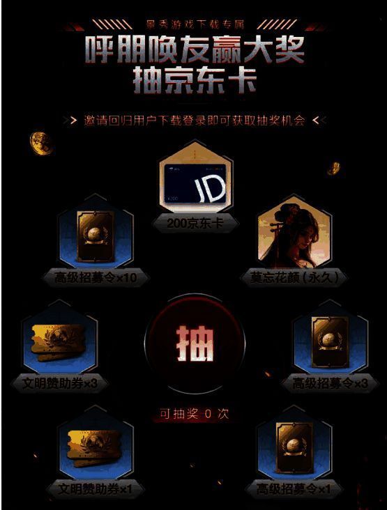 如果你是一直在游玩的老玩家,在这次回归活动中仍能“白嫖”到奖励,参与邀请好友活动,邀请好友有几率获得京东卡以及英雄皮肤,稳赚不亏!同时,邀请回归玩家下载登录还可累计抽奖机会,赢得京东卡、招募令、永久皮肤等多重豪礼。