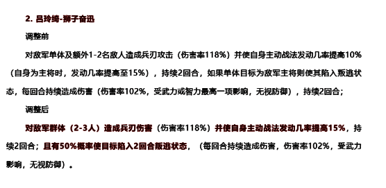 以改版后的吕绮玲为例,去年官方调整了吕绮玲的自带战法“狮子奋迅”,使其一跃成为又一平民神将。和之前相比,加强后的吕绮玲伤害非常可观,通过自带战法的多段伤害和提高发动概率的增益效果可以打出爆发伤害,几支主流搭配队伍针对各种版本的阵容都能打出优势局,提高了出场机会。