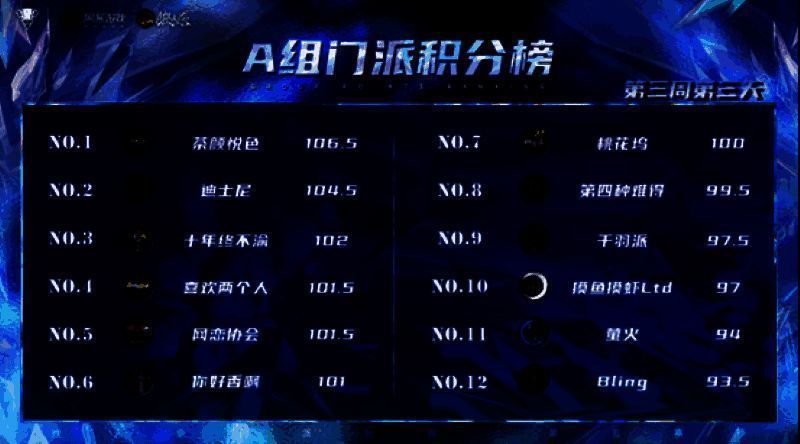 第三周的积分榜目前已经正式发布,按照赛制规则,本周部分门派迎来了交替组别,同时各门派回归到初始一百积分,A组中茶颜悦色门派目前以106.5分暂时位居第一,前两周发挥较为出色的第四种难得门派本周表现欠佳,目前位于第八位;此前在B组中表现比较稳定的十年终不渝门派目前在A组发挥的同样出色,目前位于第三位。