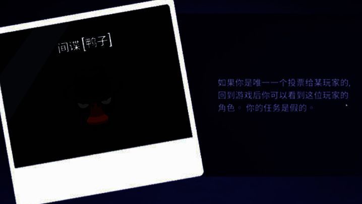 间谍属于鸭子阵营,因此是一个反派角色。在投票阶段,如果只有你一个人投票给某位玩家,那么再重新回到游戏之后,你就能够看到这位玩家真实的角色身份,但需要到下一轮投票的时候才会显示出来。当你选择这个角色之后,切记一定要隐藏好自己的身份,选择一些不容易轻易被刀的角色来作为自己的伪装。在发言的时候,尽量把自己伪装成鹅阵营的玩家,降低自己的嫌疑。