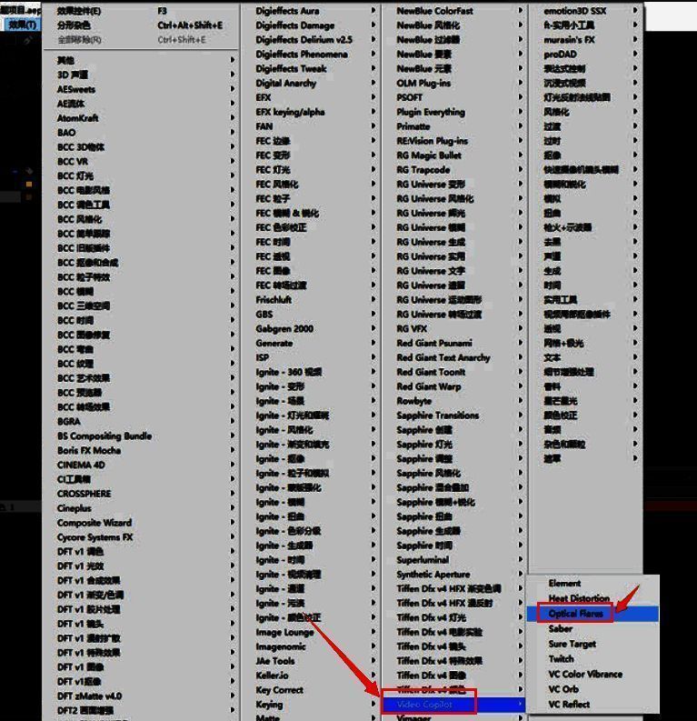 3.接着,点击video copilot子栏目中的optical flares发光光斑效果添加即可